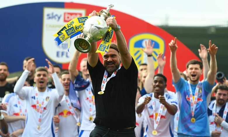PLYMOUTH, ENGLAND - MAY 03: Daniel Farke, Manager of Leeds United, acknowledges the fans, while holding the Sky Bet Championship trophy after the teams 2-1 victory, which confirmed that the team has won the Sky Bet Championship and promotion to the Premier League following the Sky Bet Championship match between Plymouth Argyle FC and Leeds United FC at Home Park on May 03, 2025 in Plymouth, England. (Photo by Harry Trump/Getty Images)
