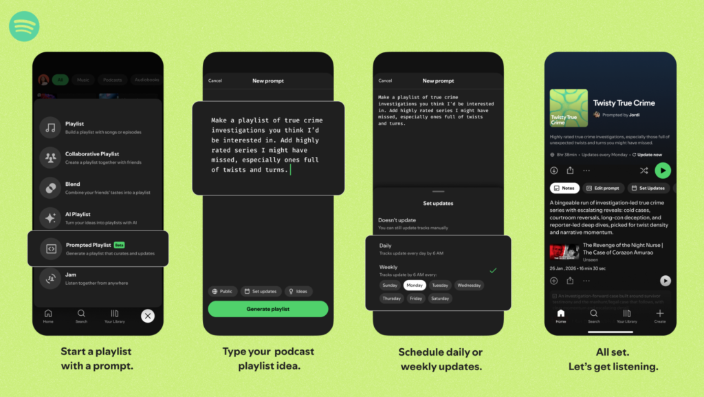أصبح بإمكان مستخدمي أداة قوائم التشغيل المعتمدة على الذكاء الاصطناعي في منصة سبوتيفاي الآن استخدامها للبودكاست، بعد أن تم إطلاق هذه الميزة للموسيقى في وقت سابق من هذا العام. تتيح الأداة للمستخدمين استخدام اللغة الطبيعية لوصف ما يبحثون عنه في قائمة التشغيل، بينما يقوم الخوارزم بإنجاز الباقي. وتعتبر سبوتيفاي هذه الأداة مناسبة للبودكاست، حيث يمكن للمستمعين اكتشاف عروض جديدة مفضلة أو “التعمق في موضوع أو عنصر ثقافي”.