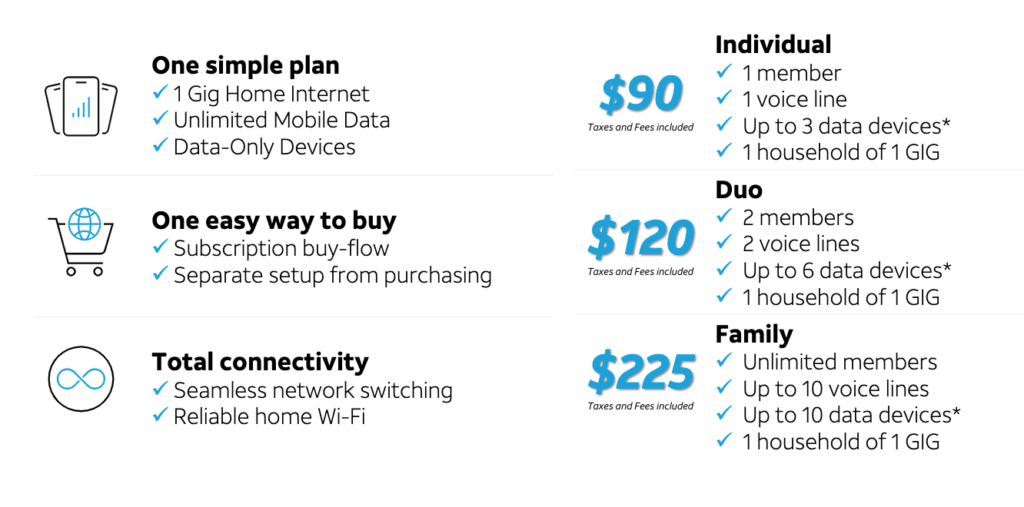 تبدأ الأسعار من 90 دولارًا شهريًا، وتشمل خط هاتف واحد وبيانات غير محدودة. كما تغطي هذه الخطة بيانات الهاتف المحمول لثلاثة أجهزة يختارها المستخدم، مثل الساعات الذكية والأجهزة اللوحية.
