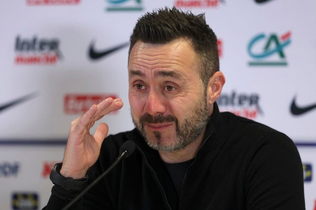 MARSEILLE, FRANCE - FEBRUARY 3: Head Coach Roberto De Zerbi of Olympique de Marseille speaks after the French Cup match between Olympique de Marseille and Stade Rennais at Orange Velodrome on February 3, 2026 in Marseille, France. (Photo by Neal Simpson/Sportsphoto/Allstar via Getty Images)