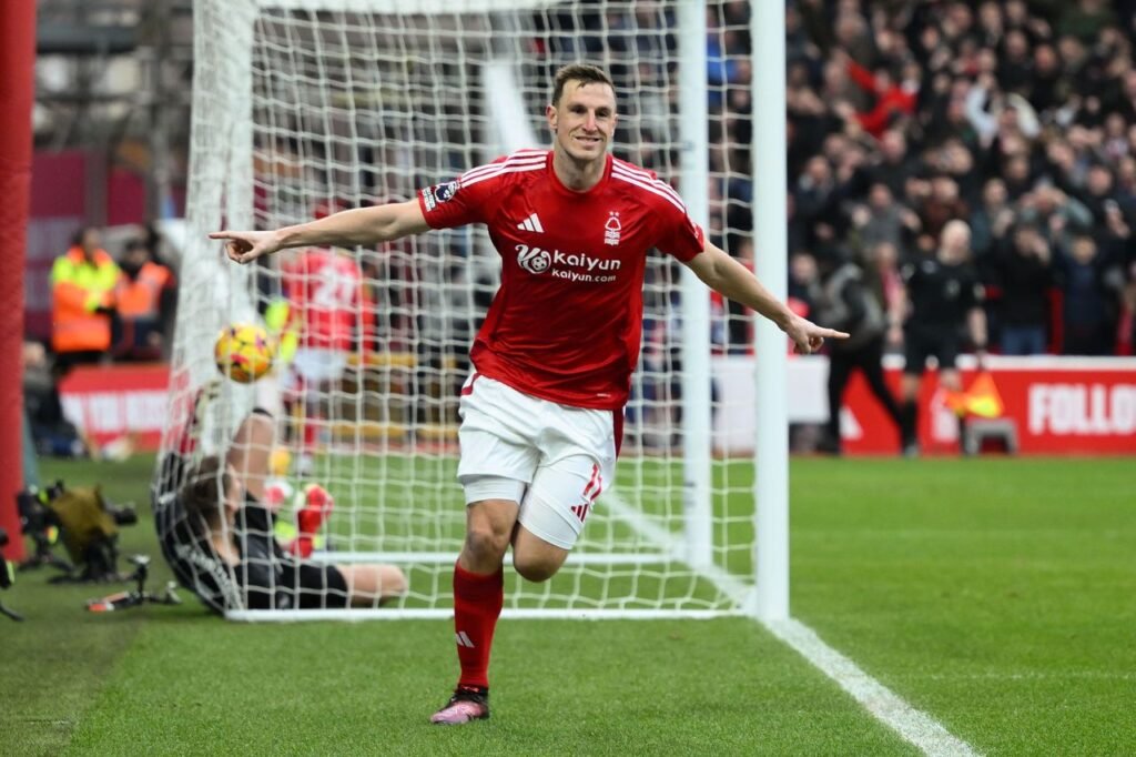 2SBB9TK Chris Wood of Nottingham Forest celebrates after scoring a goal to make it 4-0 during the Premier League match between Nottingham Forest and Brighton and Hove Albion at the City Ground, Nottingham on Saturday 1st February 2025. (Photo: Jon Hobley | MI News) Credit: MI News & Sport /Alamy Live News